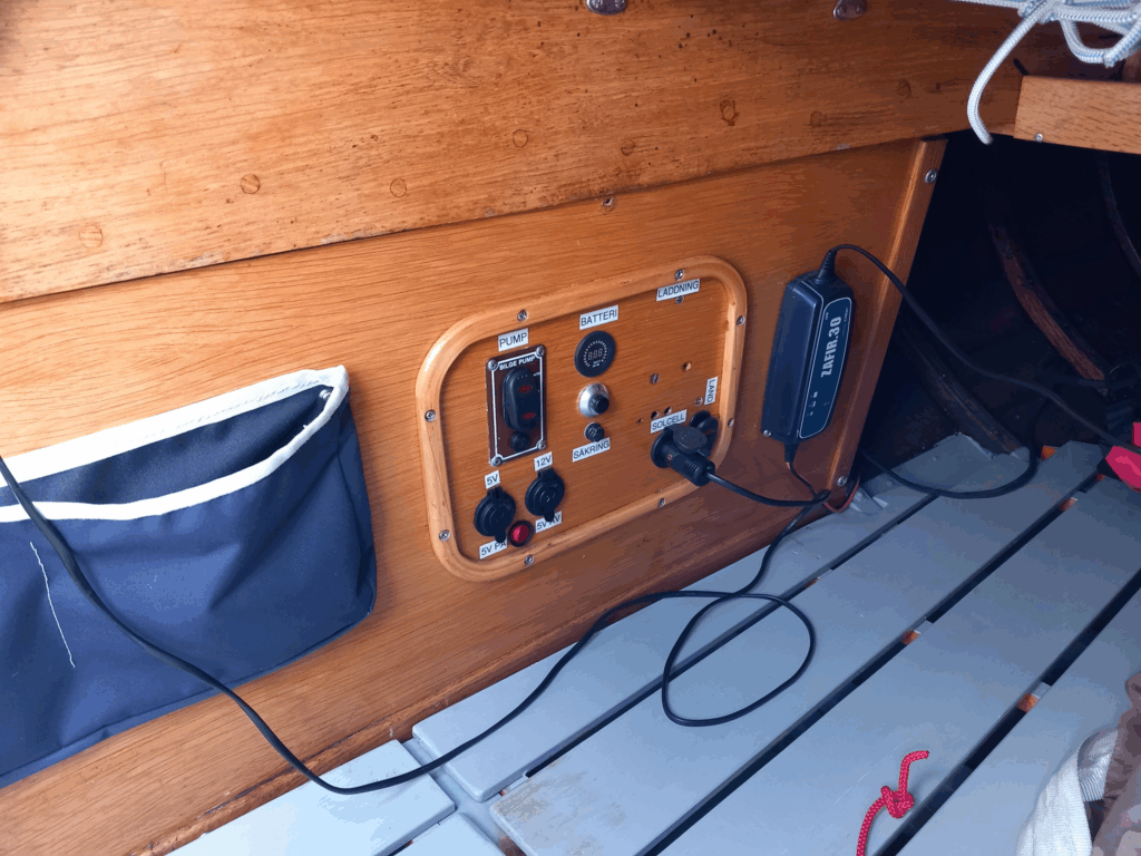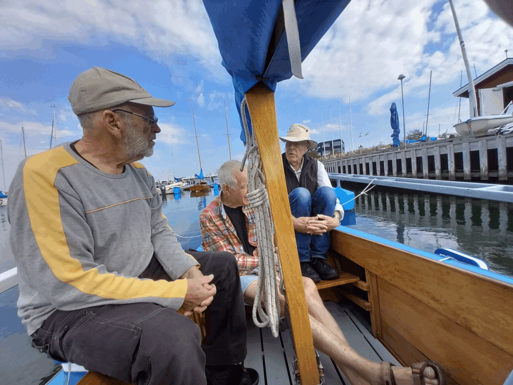 Så det fick bli bryggsegling och det kan ju också vara trevligt. Vi fick fikat och avhandlat mycket i den lilla sittbrunnen, om båtar och segling naturligtvis, men halkade naturligtvis också in på datorer, det är väl oundvikligt. Observerade vatten under våra fötter, fel, det skall vara på utsidan! Men båten, en konstuktion från 1920-talet (tror jag) innehöll en del High Tech. Nämligen solcell på kappen, batteri, fin panel och en dränkbar pump. Men systemet fungerade tydligen inte nu. Jag hittade ett öskar i fören, blev öskarl och skopade ut minst 50 liter vatten.
